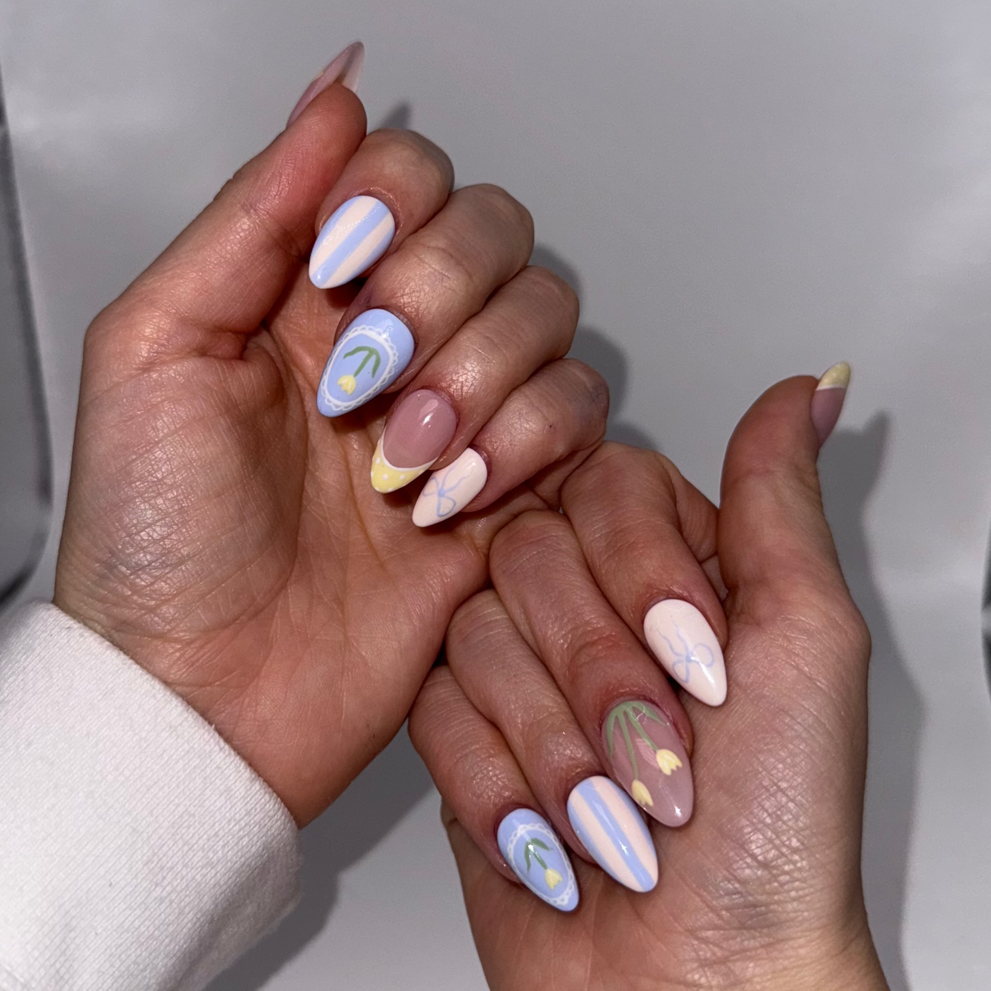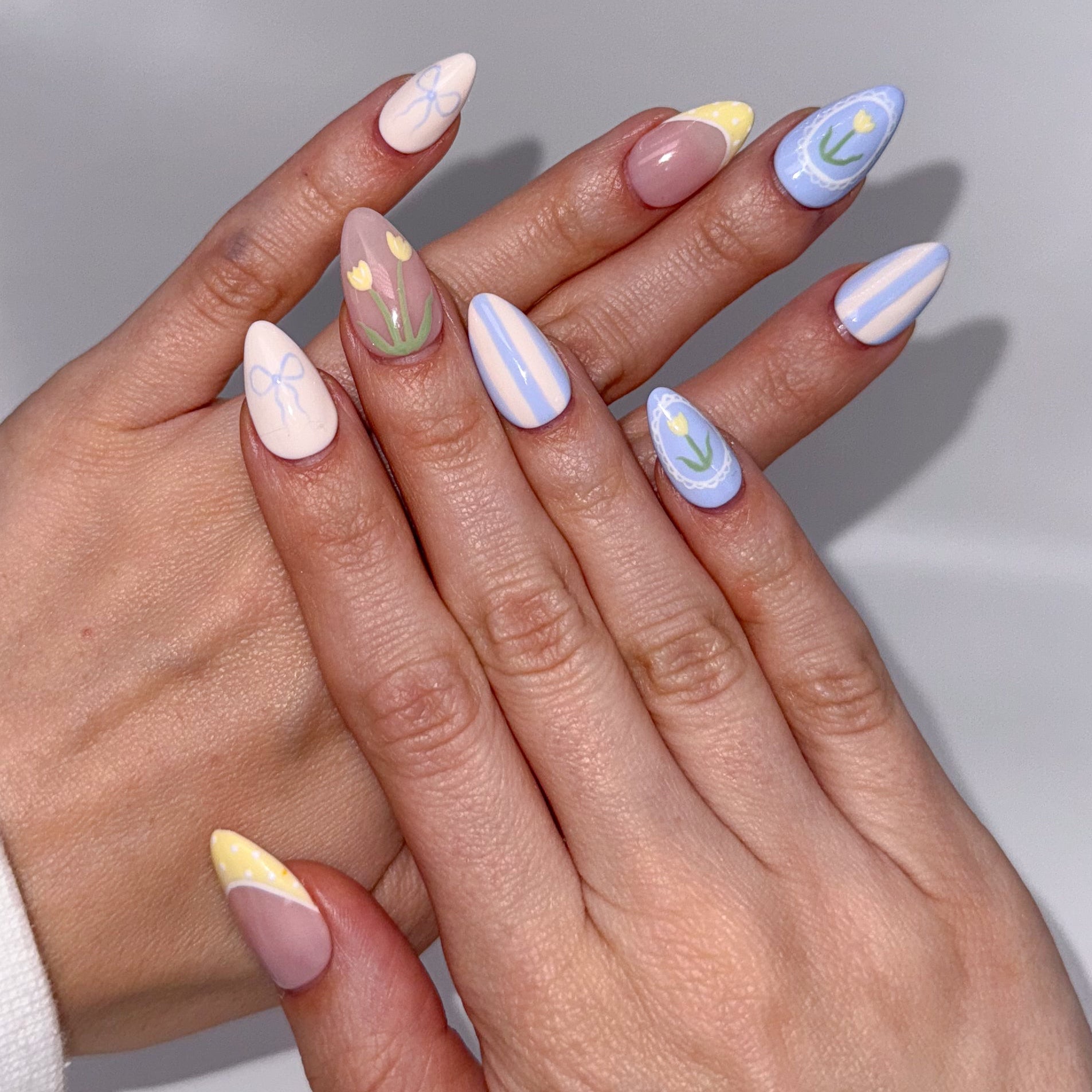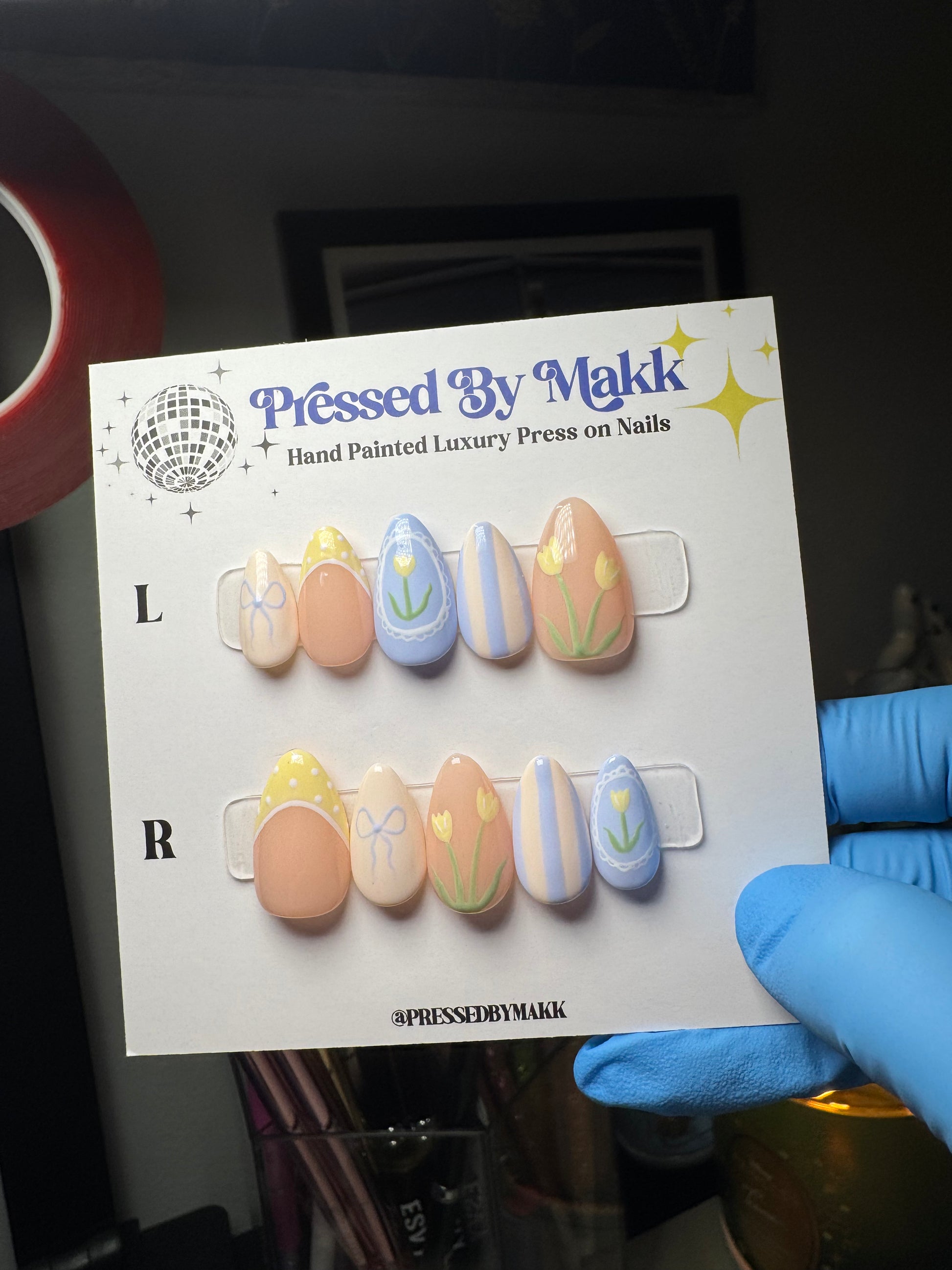 PressedByMakk luxury press on nails are all hand painted and custom just for you. They last 2+ weeks and are even reusable! Send me a message or order your sizing kit to start your order today!🪩✨💙