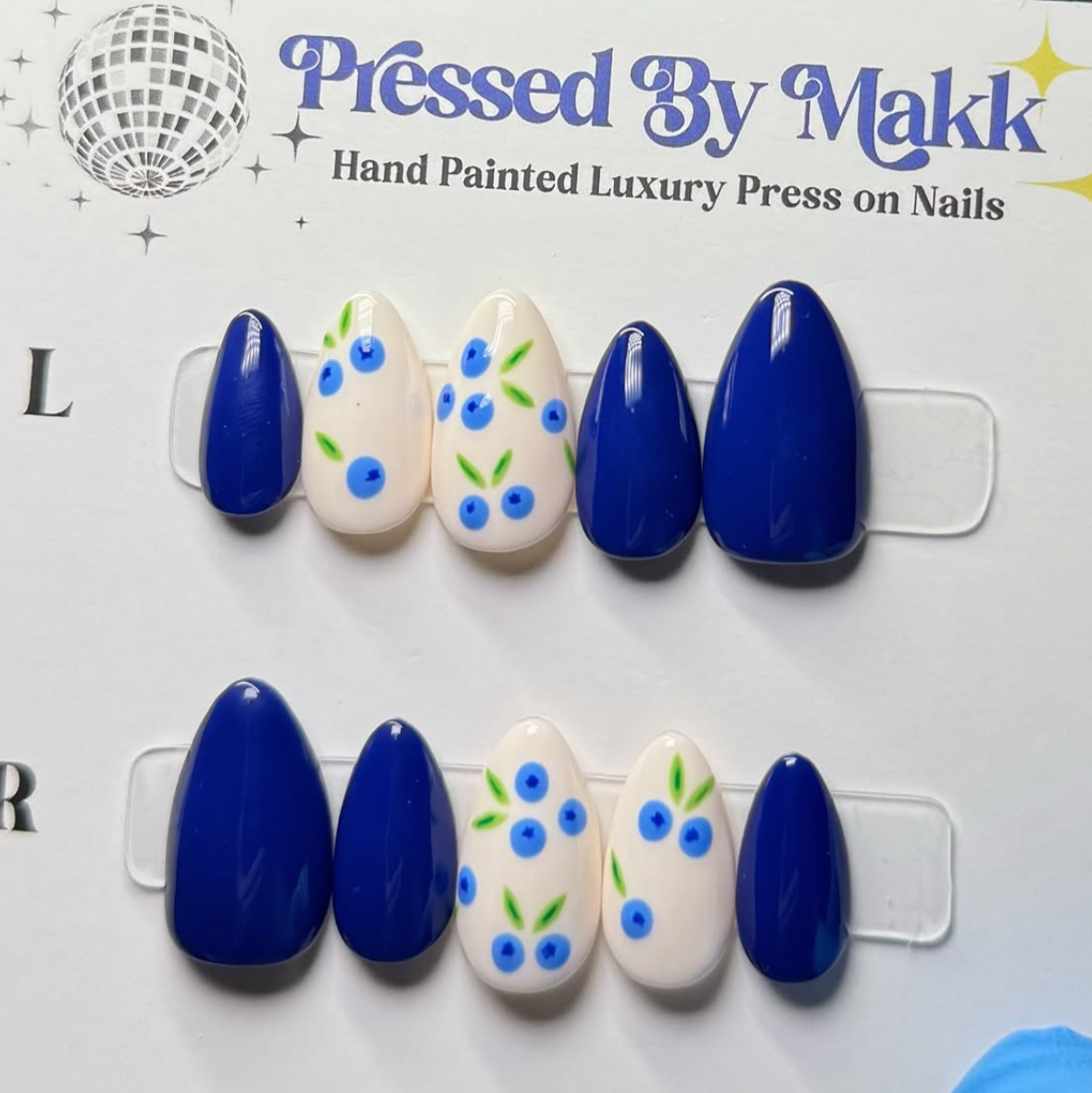 PressedByMakk luxury press on nails are all hand painted and custom just for you. They last 2+ weeks and are even reusable! Send me a message or order your sizing kit to start your order today!🪩✨💙