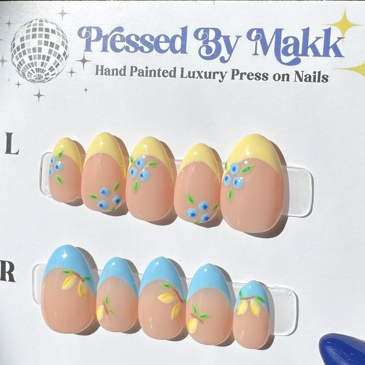 PressedByMakk luxury press on nails are all hand painted and custom just for you. They last 2+ weeks and are even reusable! Send me a message or order your sizing kit to start your order today!🪩✨💙
