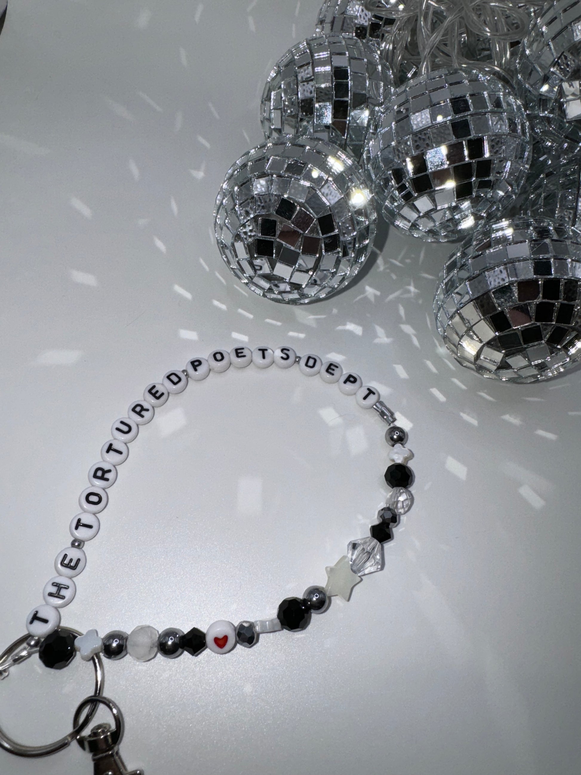Custom beaded wristlet/friendship bracelet keychain. Fully custom to have any saying, name, or song on it! Or you can do just charms as well!