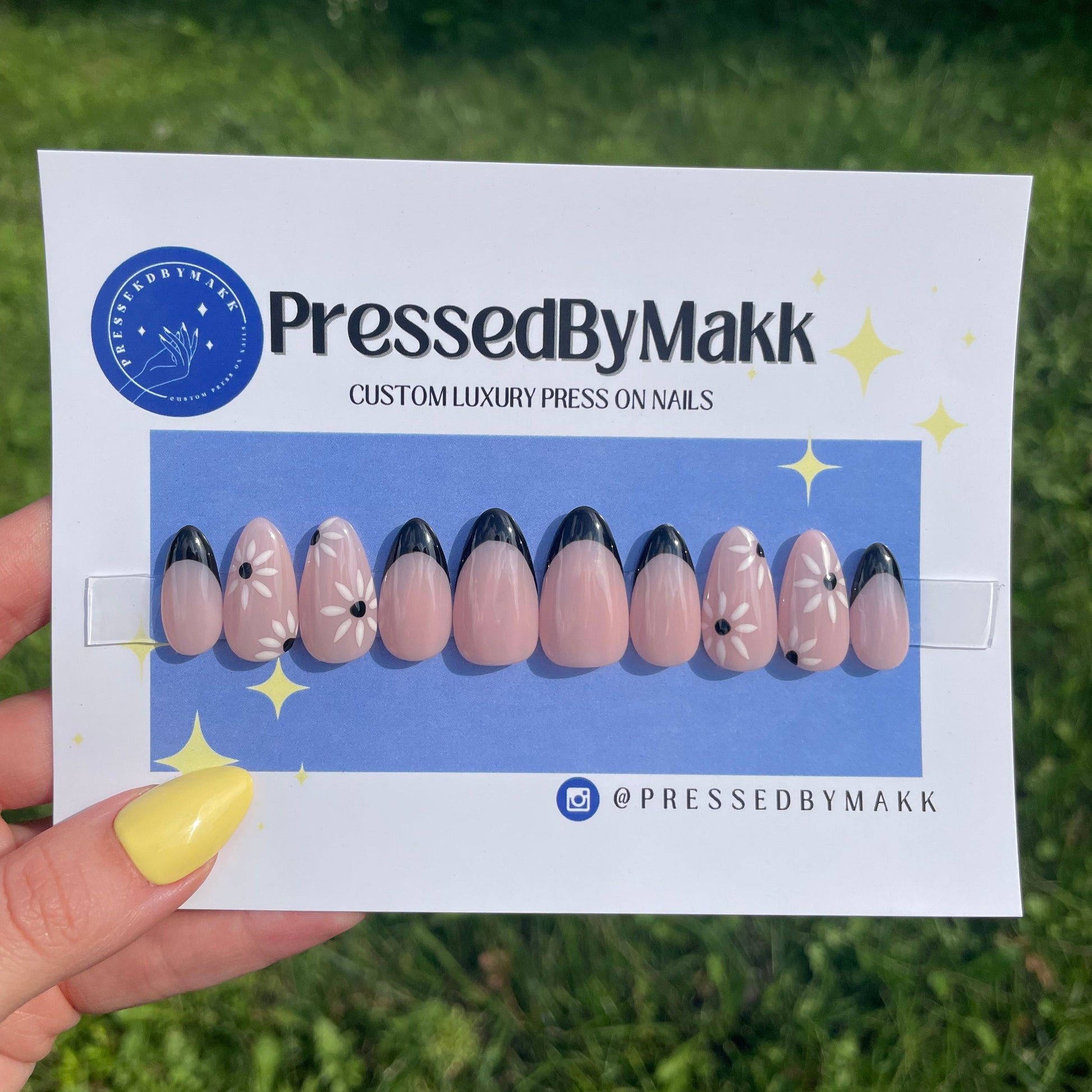 PressedByMakk luxury press on nails are all hand painted and custom just for you. They last 2+ weeks and are even reusable! Send me a message or order your sizing kit to start your order today!🪩✨💙