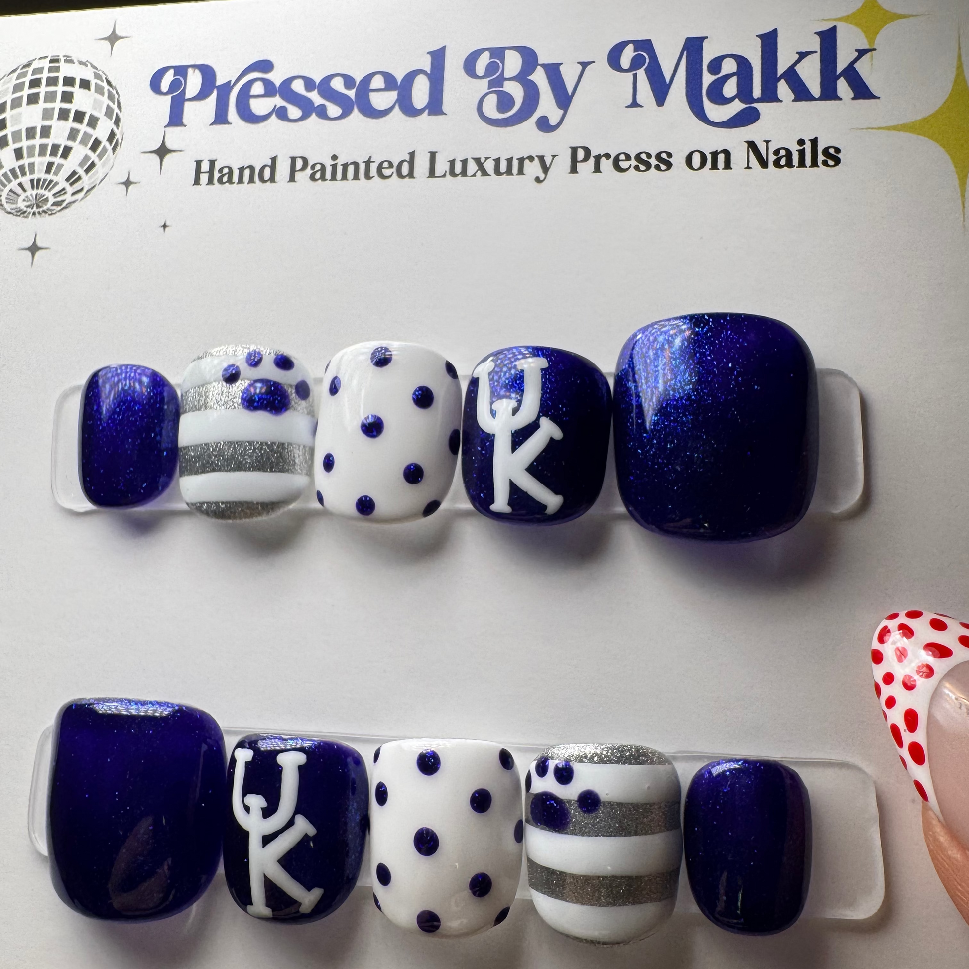 PressedByMakk luxury press on nails are all hand painted and custom just for you. They last 2+ weeks and are even reusable! Send me a message or order your sizing kit to start your order today!🪩✨💙