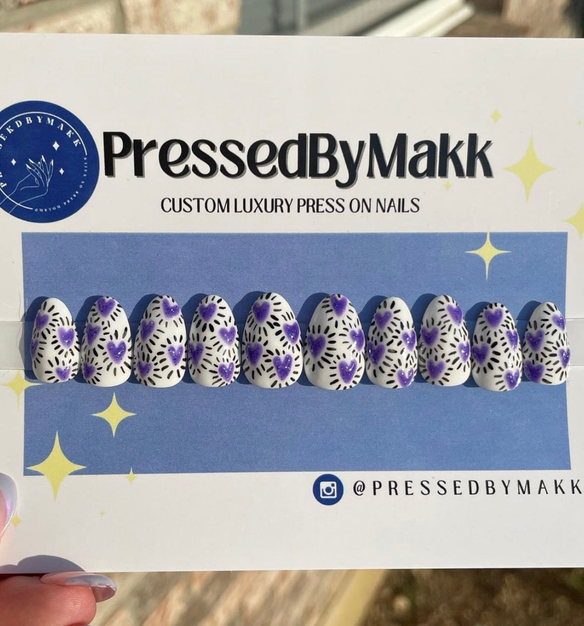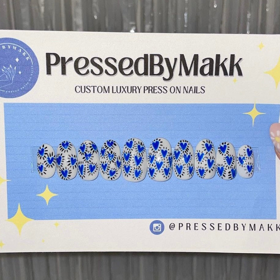 PressedByMakk luxury press on nails are all hand painted and custom just for you. They last 2+ weeks and are even reusable! Send me a message or order your sizing kit to start your order today!🪩✨💙