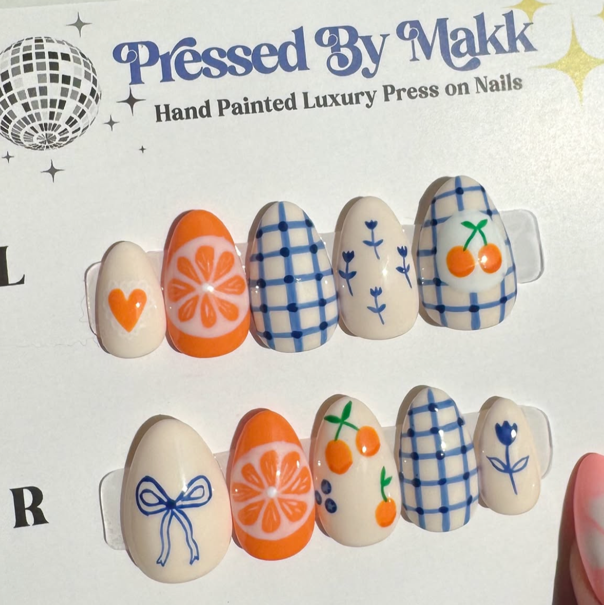 PressedByMakk luxury press on nails are all hand painted and custom just for you. They last 2+ weeks and are even reusable! Send me a message or order your sizing kit to start your order today!🪩✨💙