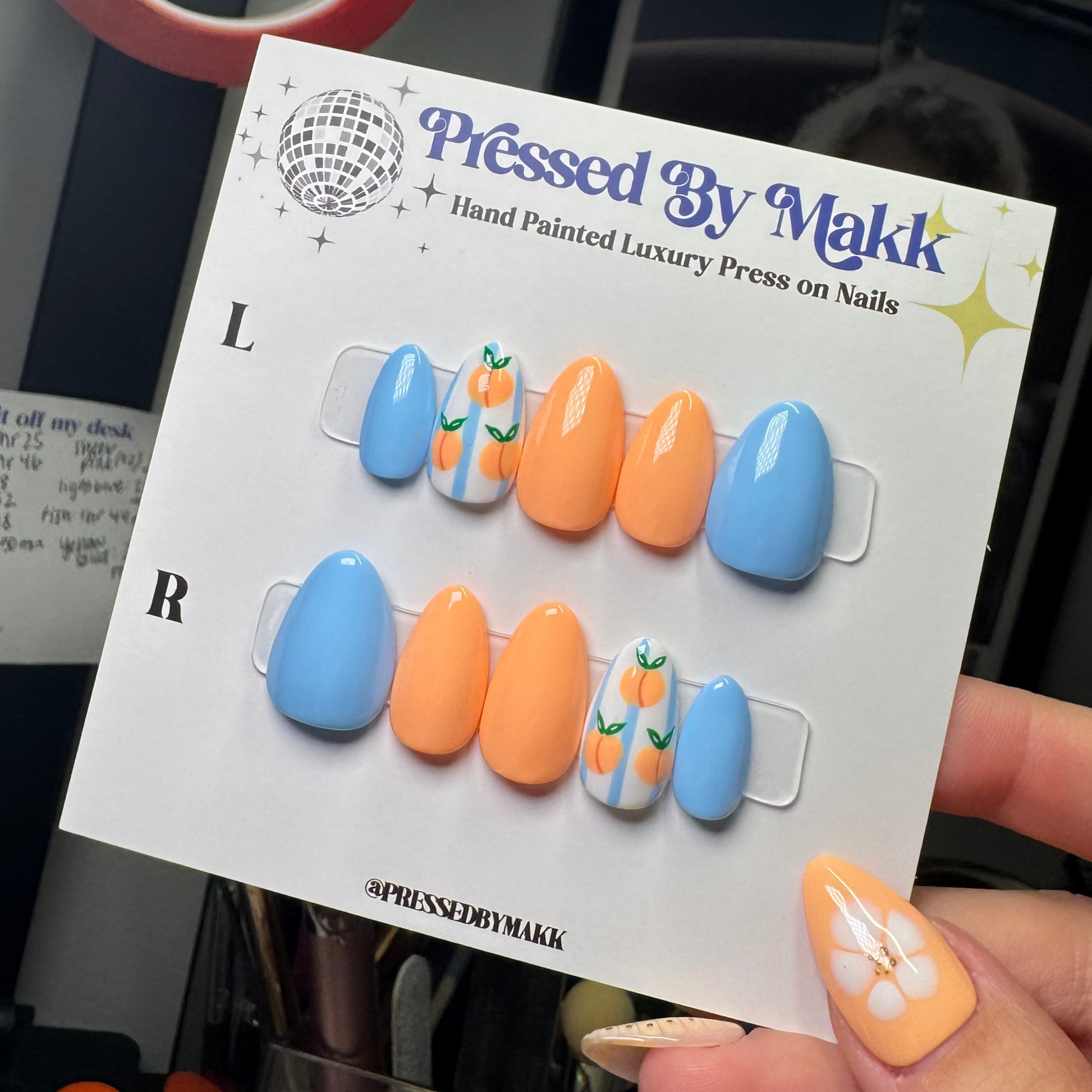 PressedByMakk luxury press on nails are all hand painted and custom just for you. They last 2+ weeks and are even reusable! Send me a message or order your sizing kit to start your order today!🪩✨💙