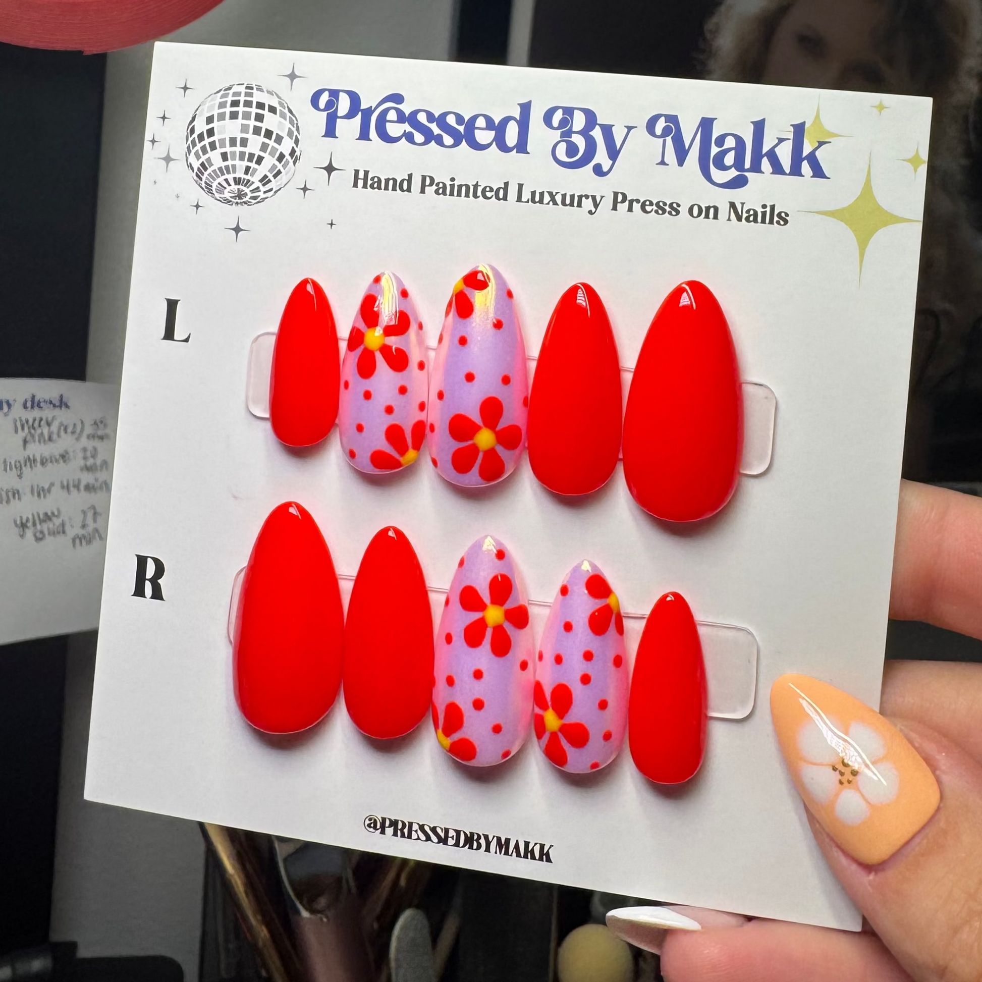 PressedByMakk luxury press on nails are all hand painted and custom just for you. They last 2+ weeks and are even reusable! Send me a message or order your sizing kit to start your order today!🪩✨💙